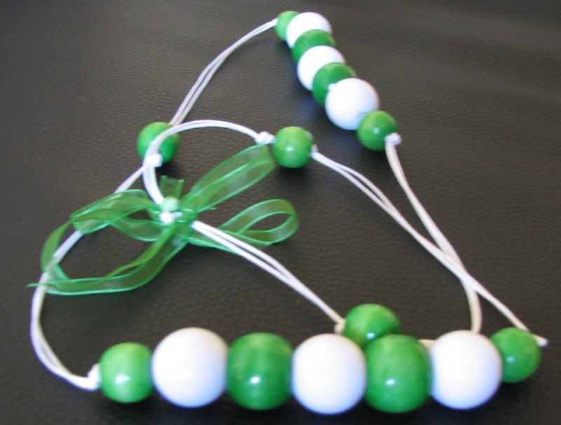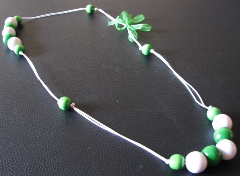 Colar com bolas de madeira verde e bolas sintéticas brancas